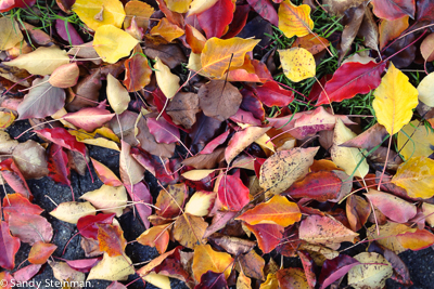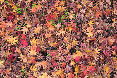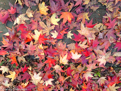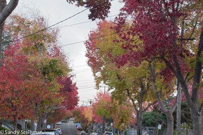 Berkeley, CA has many trees that are still showing good fall color. Unfortunately, we also have many power, phone and cable lines above ground. When I walked around town today taking fall color photos, I found I did much better photographing the leaves on the ground. I did include one photo of the trees and power lines just for show. The street with the power lines and trees is McGee Street by the Berkeley Horticultural Nursery. It has some of the best local color due to the street being lined with Sweet Gum/Liquidambar styraciflua trees.