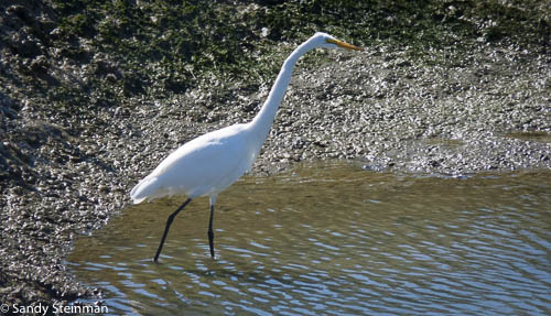Today we did a short birding walk along the Richmond Bay Trail. It was sunny, windy with white caps on the bay, early afternoon and between high and low tide. Not the best conditions for birding. We did see 15 species, which is a less than usual for the area. Most numerous were the White-crowned Sparrows flitting in and out of the shrubs and trees.