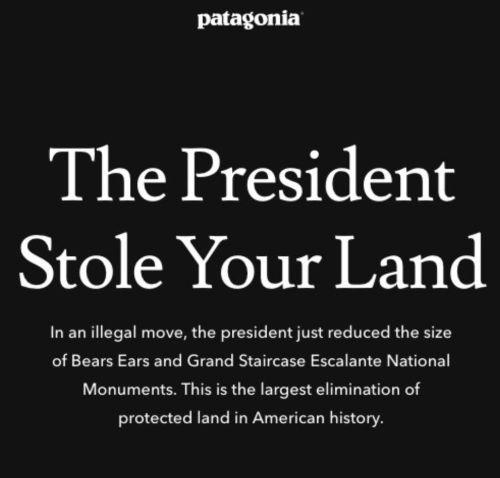 “The president stole your land,” Patagonia said in a pop-up message on its website. “In an illegal move, the president just reduced the size of Bears Ears and Grand Staircase-Escalante National Monuments. This is the largest elimination of protected land in American history.”