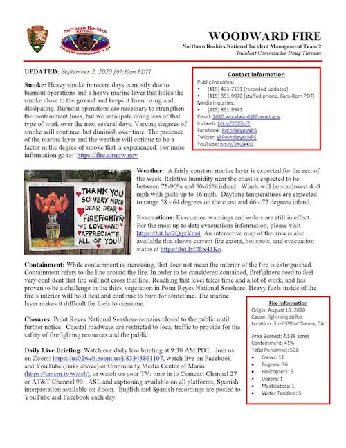 Pt. Reyes Woodward Fire & Smoke Update 9/2/20