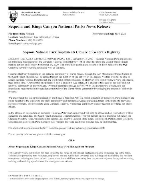 Sequoia National Park Closes Generals Highway