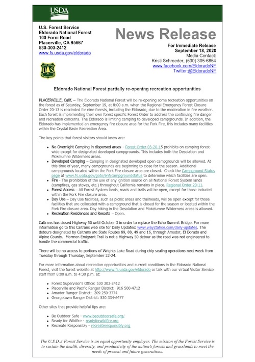 Eldorado National Forest Partial Re-opening