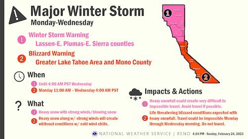 A major winter storm is expected to produce heavy snowfall across northeast California, the Sierra Nevada, and Mono County. Across the Sierra Nevada and Mono County, blizzard conditions are expected with heavy snowfall and strong winds, which could result in near zero visibility at times due to blowing snow. Sub-zero wind chills will also occur across the Sierra through Wednesday.
