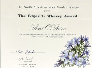 from the East BayRegional Parks Botanic Garden Garden Director Bart O’Brien Receives the Edgar T. Wherry AwardThe North American Rock Garden Society has just honored Botanic Garden Director Bart O’Brien with the Edgar T. Wherry Award. |